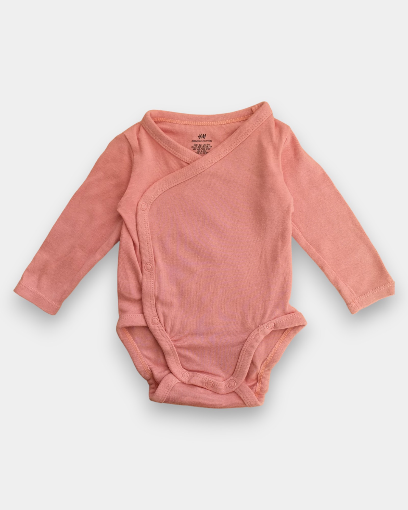 Långärmad omlottbody med knappar och en fastsydd bodydel med tryckknappar i grenen.
