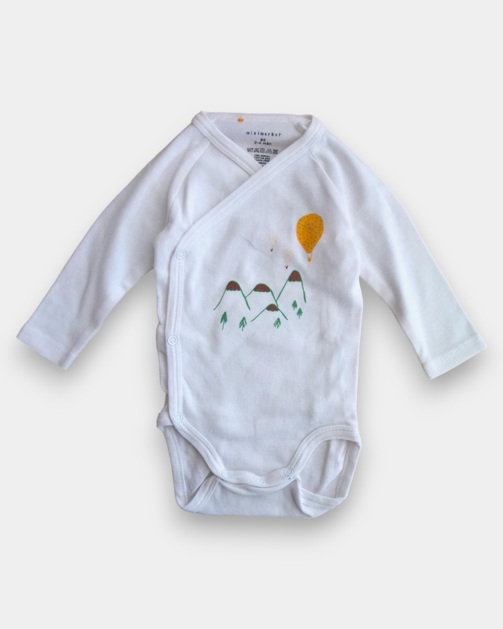Vit långärmad omlottbody med tryckknappar och grafiskt tryck med berg och luftballong.