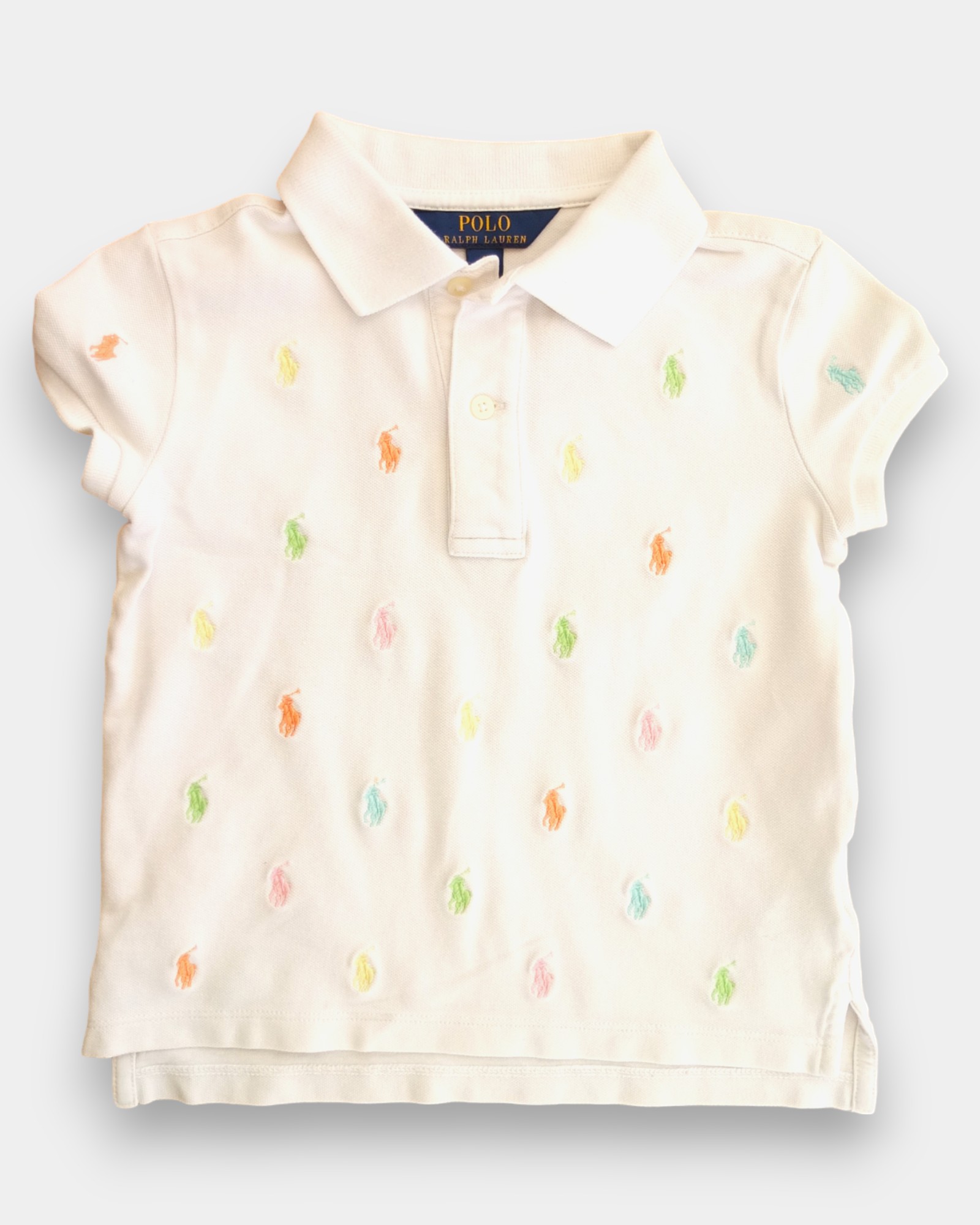 Pikétröja med krage och knappslå, prydd med flerfärgat broderat mönster.