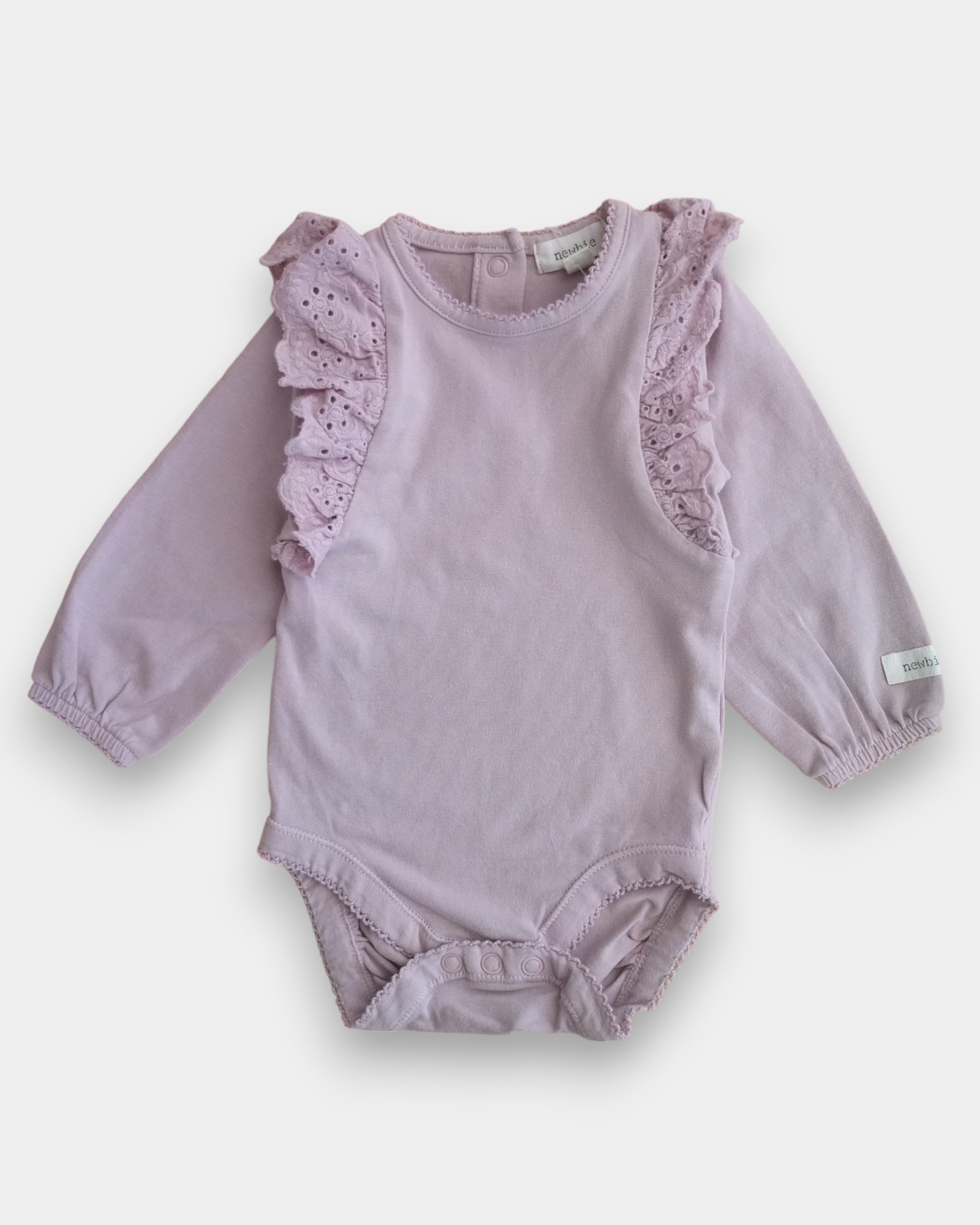 Body med långa ärmar, volanger och broderade detaljer.