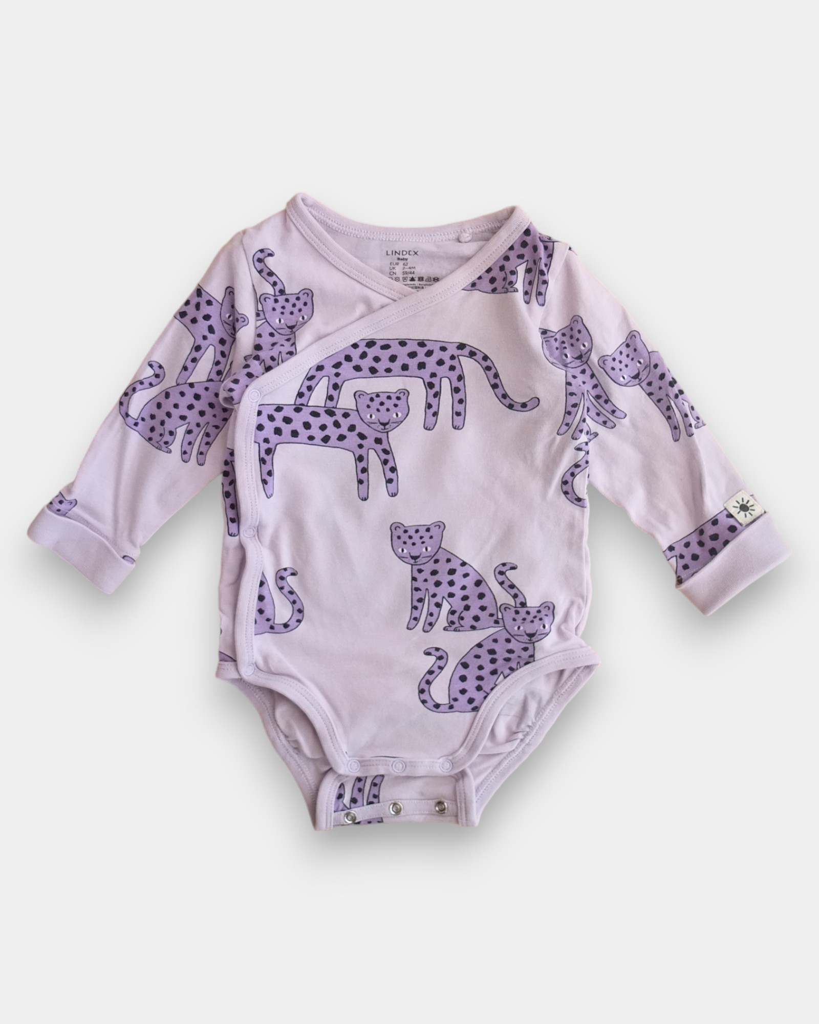 Långärmad body med omlottöppning, prydd med ett djurmönster. Färgen är ljus med mörkare detaljer på ärmarnas kant och runt halsen. Tryckknappar finns längst ned för enkel på- och avklädnad.